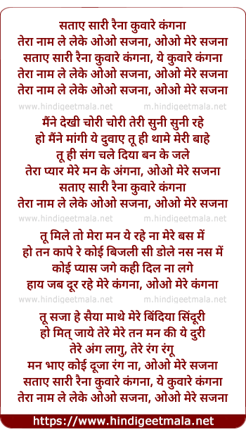 Lyrics of Sataye Sari Raina Kunwaare Kangana - सताए सारी रैना कुवारे कंगना