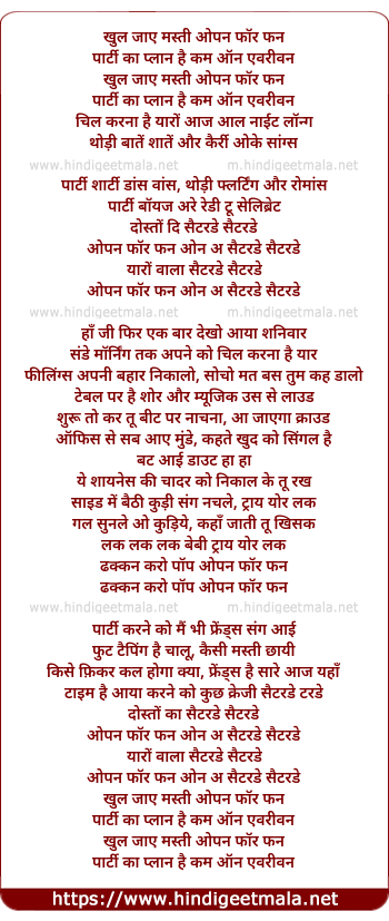 Lyrics of Saturday Saturday (Khul Jaaye Masti) - खुल जाए मस्ती ओपन फॉर फन