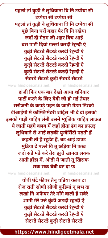Lyrics of Saturday Saturday (Remix) - पहलां तां कुड़ी ने लुधियाना वि नि टप्पेया सी