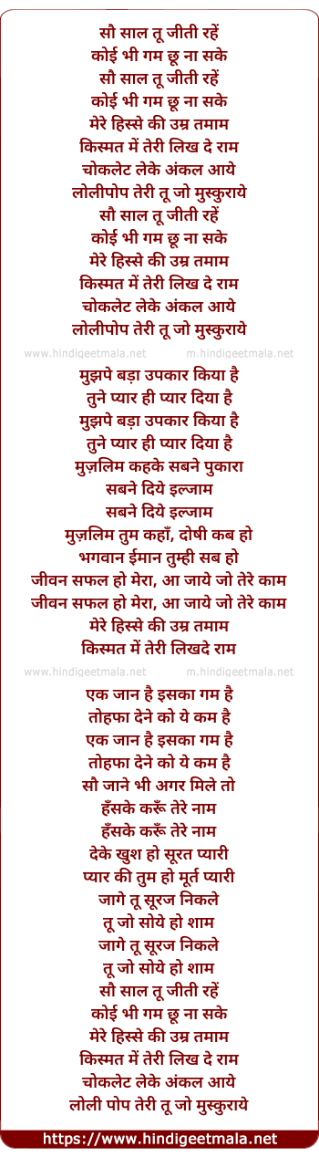 Lyrics of Sau Saal Tu Jeeti Rahe - सौ साल तू जीती रहें
