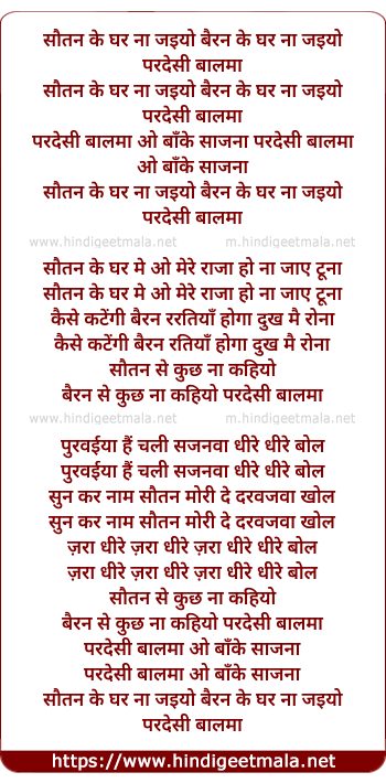 Lyrics of Sautan Ke Ghar Na Jaiyo - सौतन के घर ना जइयो बैरन के घर ना जइयो