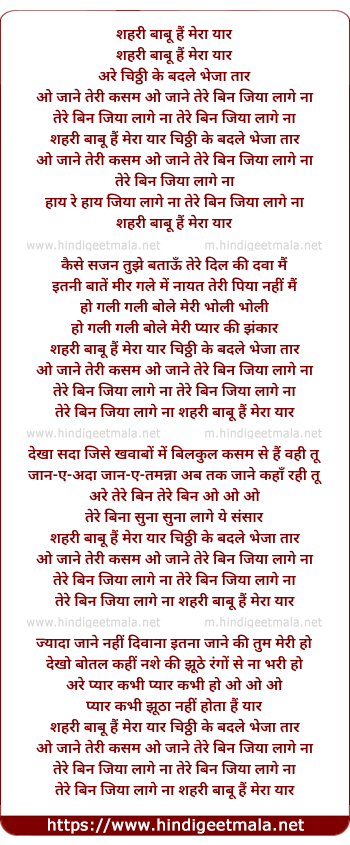 Lyrics of Sehari Baabu Hai Mera Yaar - शहरी बाबू हैं मेरा यार