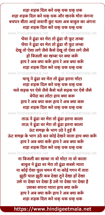 Lyrics of Shada Shadak Dil Kare Dhak Dhak Aur Khanke Mora - शड़ा शड़क दिल करे धक् धक धक् धक और खनके मोरा