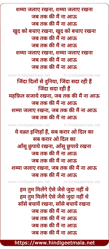 Lyrics of Shamma Jalae Rakhna - शम्मा जलाए रखना, शम्मा जलाए रखना