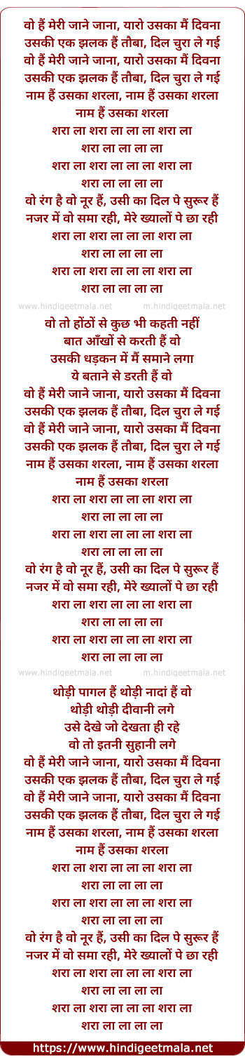 Lyrics of Vo Hai Meri Jane Jana (Shara La) - वो हैं मेरी जाने जाना, यारो उसका मैं दिवना