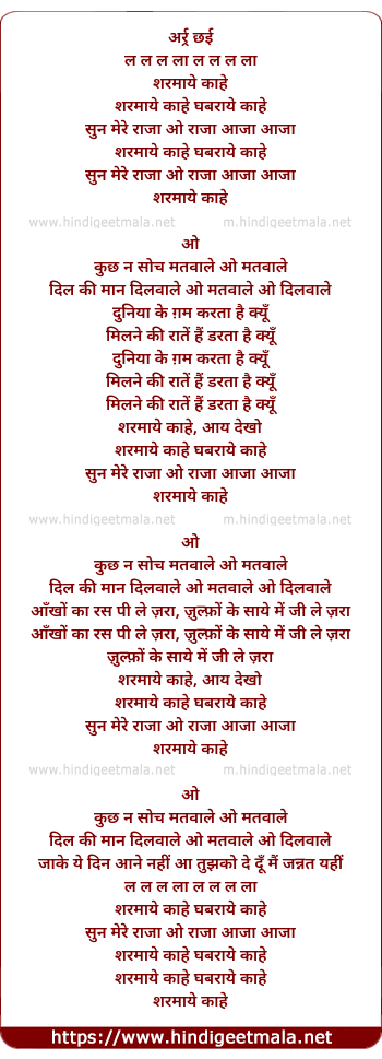 Lyrics of Sharmaaye Kaahe Ghabraaye Kaahe Sun Mere Rajaa - शरमाये काहे घबराये काहे सुन मेरे राजा