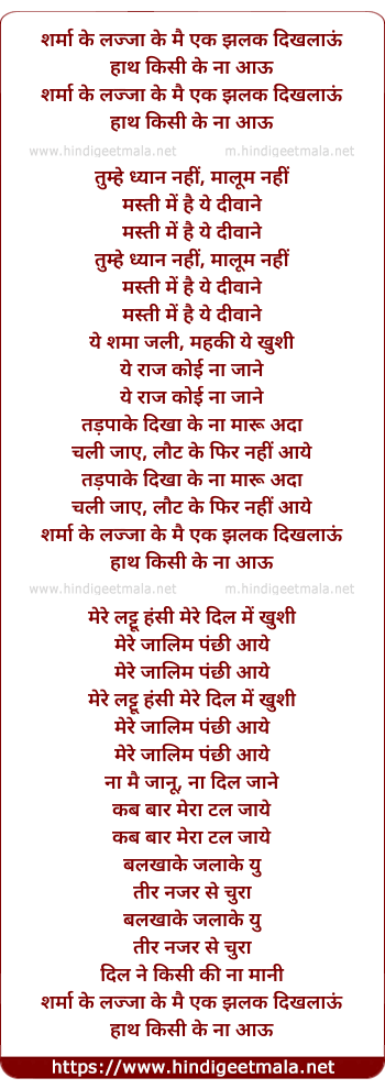 Lyrics of Sharma Ke Lajja Ke Mai Ek Jhalak Dikhlau - शर्मा के लज्जा के मै एक झलक दिखलाऊं
