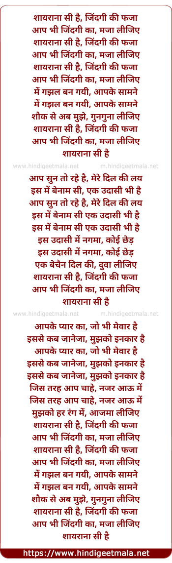 Lyrics of Shayaraana Si Hai Jindagi Ki Faja - शायराना सी है, जिंदगी की फजा