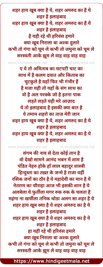 Lyrics of Shehar Haay Khub Kya Hai Yeh - शहर हाय खूब क्या है ये