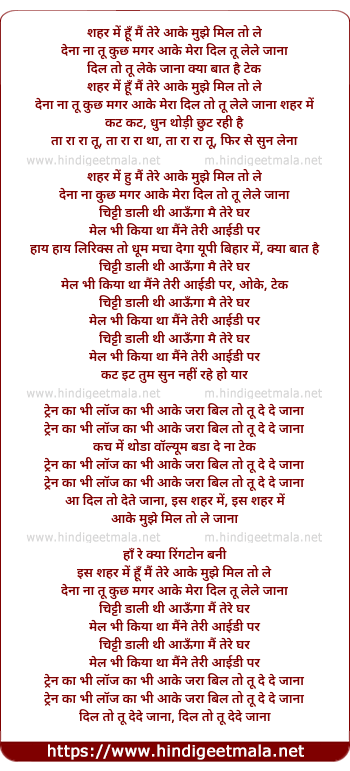 dena na tu kuch magar aake mera dil to tu lele jana sheher me