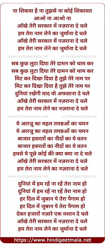 Lyrics of Shikwa Hai Naa Tujhse, Na Koi Shikayat - शिकवा है ना तुझसे, ना कोई शिकायत