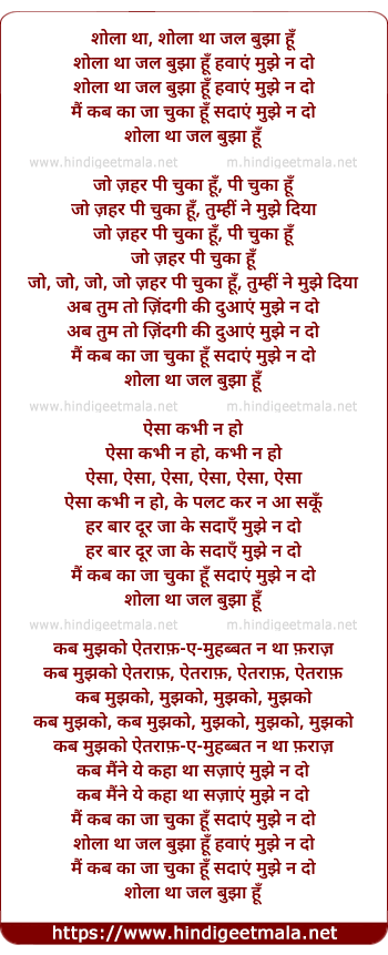 Lyrics of Sholaa Thaa Jal Bujhaa Hun Hawaaen Mujhe Na Do - शोला था, शोला था जल बुझा हूँ
