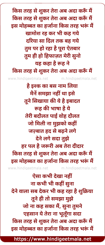 Lyrics of Kis Tarah Se Shukr Tera Adaa Karu Main - किस तरह से शुक्र तेरा अब अदा करूँ मैं