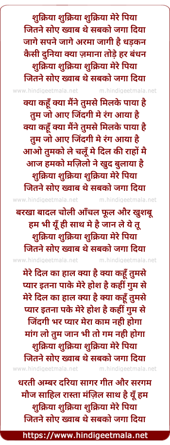 Lyrics of Shukriya Mere Piya, Jitane Soe Khvaab The - शुक्रिया मेरे पिया, जितने सोए ख्वाब थे