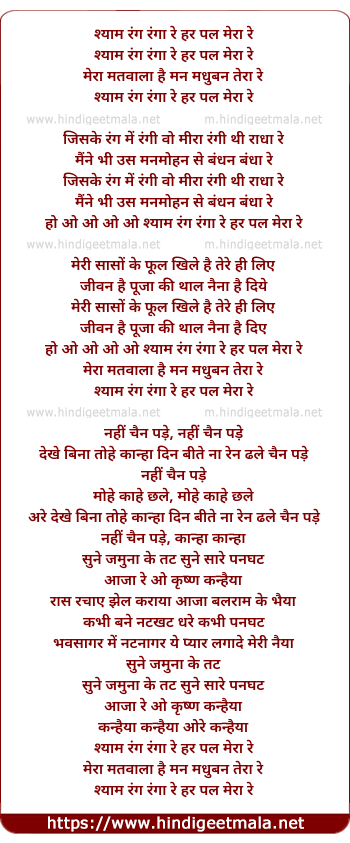 Lyrics of Shyaam Rang Rangaa Re Har Pal Meraa Re - श्याम रंग रंगा रे हर पल मेरा रे