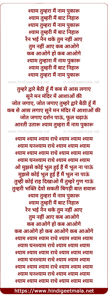 Lyrics of Shyam Tumhara Mai Naam Pukar - श्याम तुम्हरा मैं नाम पुकारू