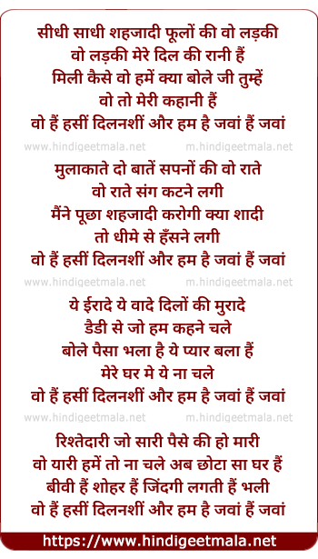Lyrics of Sidhi Sadhi Shehzadi, Phulo Ki Wo Ladki - सीधी साधी शहजादी, फूलों की वो लड़की