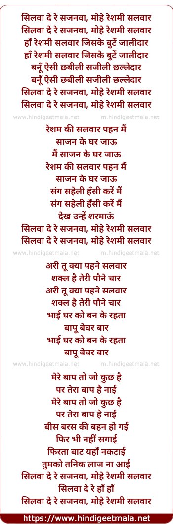 Lyrics of Silwa De Re Sajanwa Mohe Reshmi Salwar - सिलवा दे रे सजनवा, मोहे रेशमी सलवार