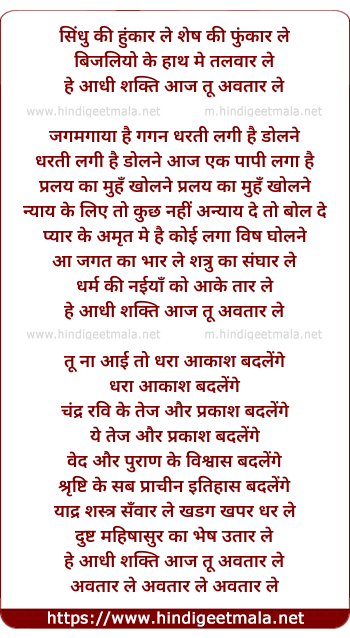 Lyrics of Sindhu Ki Hunkar Le He Aadhi Shakti Aaj Tu Awtar Le - सिंधु की हुंकार ले हे आधी शक्ति आज तू अवतार ले