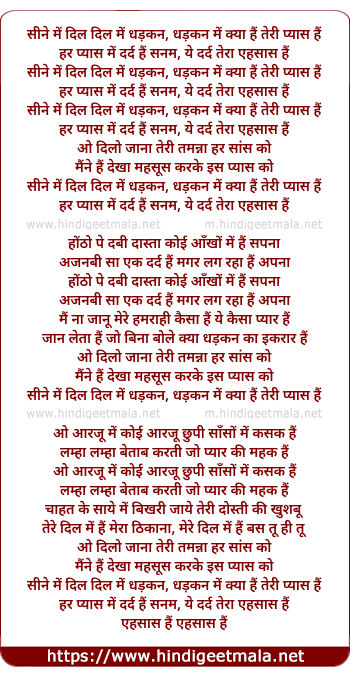 Lyrics of Sine Me Dil Dil Me Dhadkan - सीने में दिल दिल में धड़कन