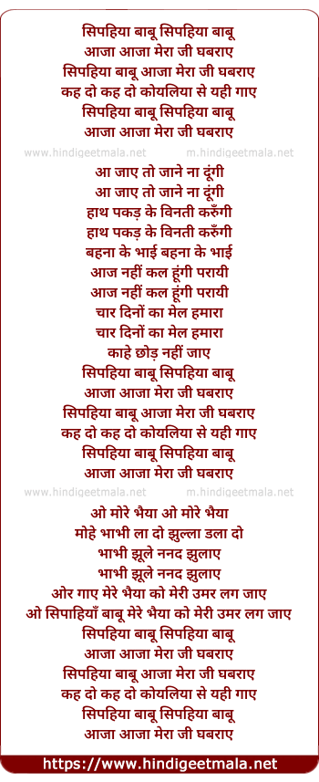 Lyrics of Sipahiya Babu Aaja - सिपहिया बाबू सिपहिया बाबू
