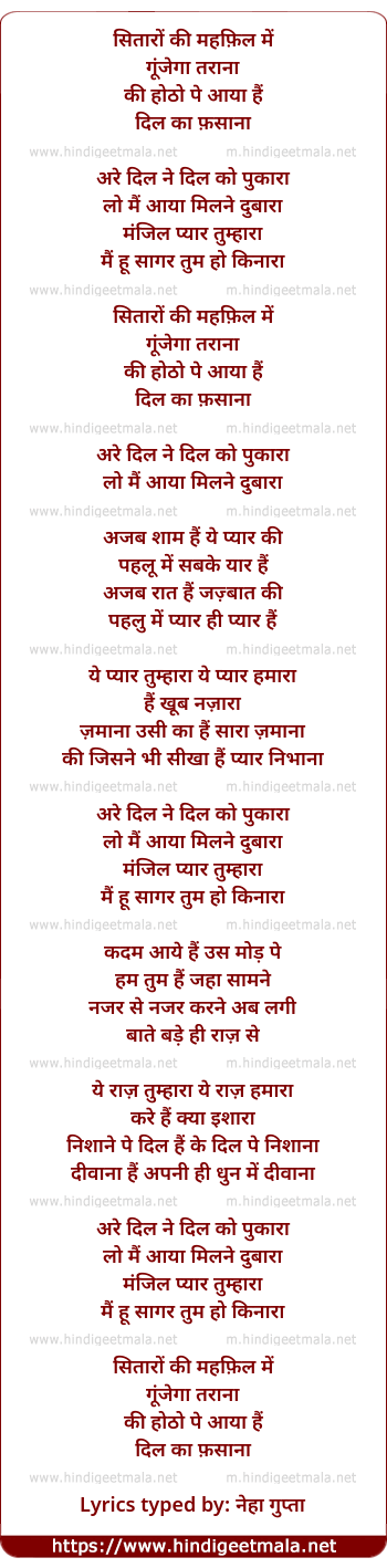 Lyrics of Sitaaron Ki Mahafil Mein, Are Dil Ne Dil Ko Pukaaraa - सितारों की महफ़िल में, अरे दिल ने दिल को पुकारा
