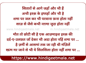 Lyrics of Sitaaron Se Aage, Shamaa Par Jal Kar Bhi Paravaanaa - सितारों से आगे, शमा पर जल कर भी परवाना