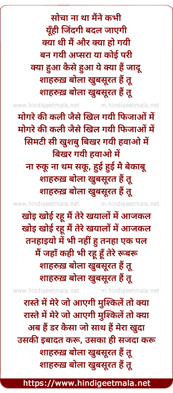 Film CastPritika Chawla, Nagesh Bhonsle, Choyoti Ghosh, Makrand Deshpande, Sanjay Dadheech, Afzal Khan, Kay Kay Menon, Shahrukh KhanSingerVasuda Sharma, Jagjit Singh, Shankar MahadevanLyricistVasuda Sharma, Makrand DeshpandeMusic ByVasuda SharmaDirectorMakrand DeshpandeProducerAmarjeet SinghExternal LinksShahrukh Bola Khoobsurat Hai Tu at IMDB Shahrukh Bola Khoobsurat Hai Tu at WikipediaYouTubeShahrukh Bola Khoobsurat Hai Tu at YT Shahrukh Bola Khoobsurat Hai Tu at YT(2)