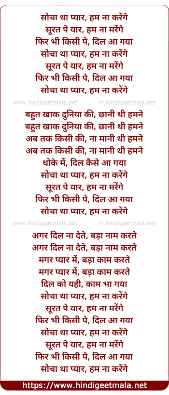 Lyrics of Socha Thaa Pyaar, Hum Naa Karenge - सोचा था प्यार, हम ना करेंगे