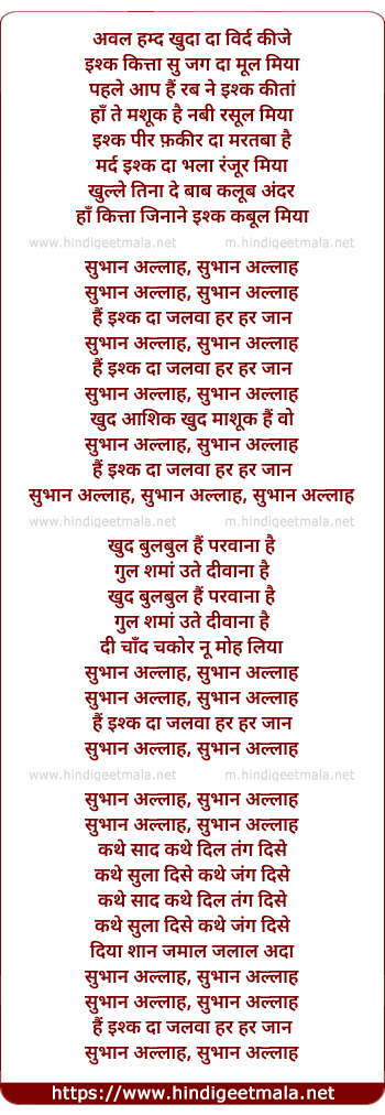 Lyrics of Subhan Alla - अवल हम्द खुदा दा विर्द कीजे