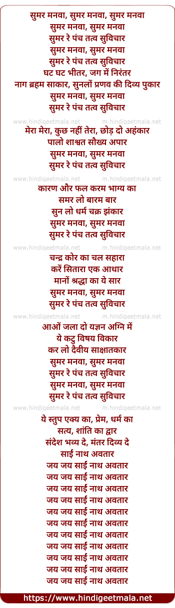 Lyrics of Sumara Manuwa Sumarale Panchatathwa - सुमर मनवा, सुमर मनवा, सुमर मनवा