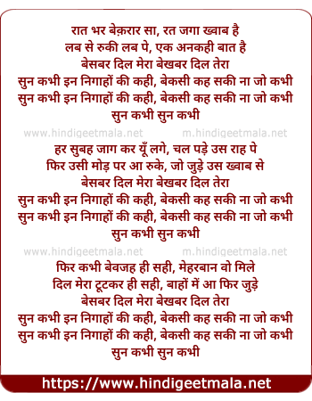 Lyrics of Sun Kabhi - रात भर बेक़रार सा, रत जगा ख्वाब है