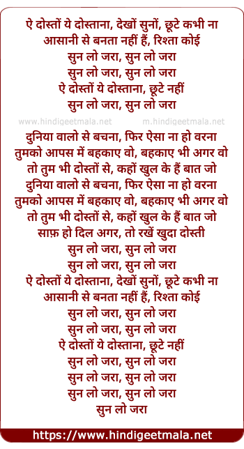 Lyrics of Sun Lo Jara - ऐ दोस्तों ये दोस्ताना, देखों सुनों, छूटे कभी ना
