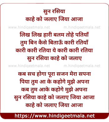 Lyrics of Sun Rasiya Kaahe Ko Jalaaye Jiya Aaja - सुन रसिया काहे को जलाए जिया आजा