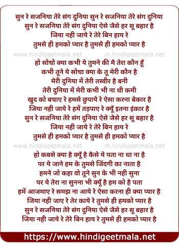 Lyrics of Sun Re Sajaniya Tere Sang Dooniya - सुन रे सजनिया तेरे संग दुनिया सुन रे सजनिया तेरे संग दुनिया