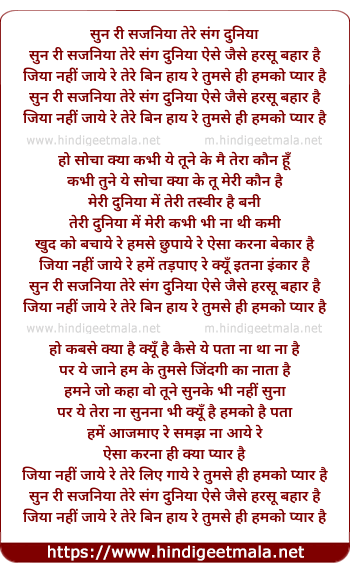 Lyrics of Sun Re Sajaniya Tere Sang Dooniya - सुन री सजनिया तेरे संग दुनिया