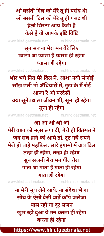 Lyrics of Sun Sajna Mera Man Tere Liye (Sad) - ओ बसंती दिल को मेरे तू ही पसंद थी