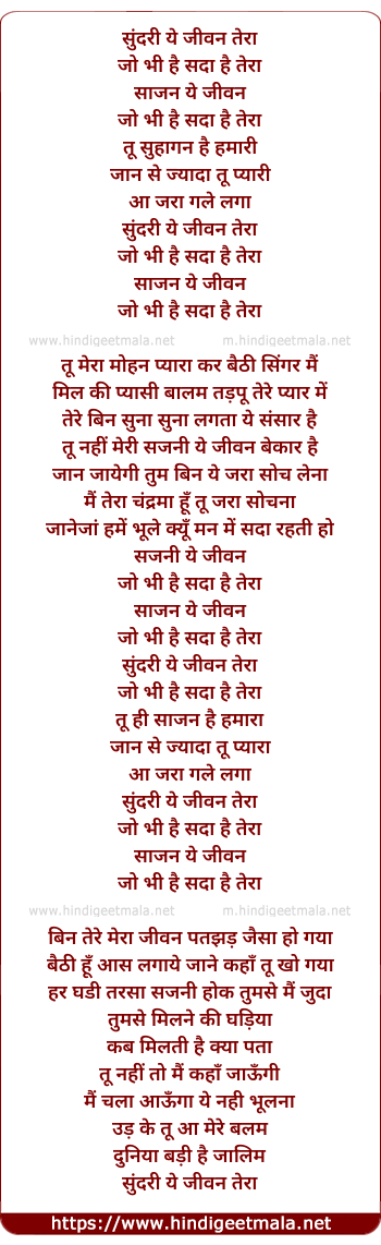 Lyrics of Sundari Ye Jiwan Tera - सुंदरी ये जीवन तेरा