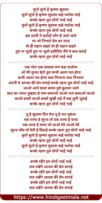 Lyrics of Suno Suno Hey Krishna Sudama - सुनो सुनो हें कृष्णा सुदामा