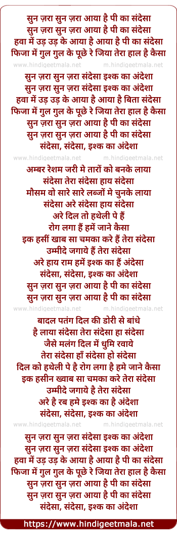 Lyrics of Sunzara Sunzara Aaya Hai Pee Ka Sandesa - सुन ज़रा सुन ज़रा आया है पी का संदेशा