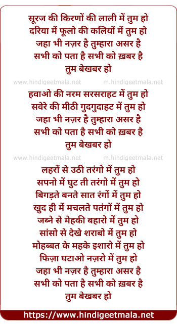 Lyrics of Suraj Kee Kirno Kee Lalee Me Tum Ho - सूरज की किरणों की लाली में तुम हो