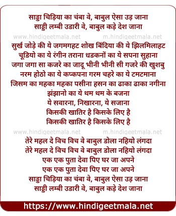 Lyrics of Sadda Chidiya Da Chamba Ve (Surkh Jode Ki Ye Jagmagahat) - साड्डा चिड़िया का चंबा वे, बाबुल ऐसा उड़ जाना