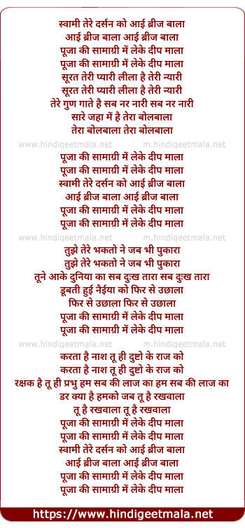 Lyrics of Swami Tere Darshan Ko Aayi Brijbala - स्वामी तेरे दर्शन को आई ब्रीज बाला