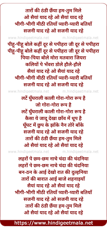 Lyrics of Taaron Kee Thandee Chhainya Ham Tum Mile - तारों की ठंडी छैंया हम-तुम मिले