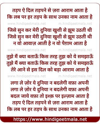 Lyrics of Tadap Ai Dil Taapane Se Zaraa Aaraam Aataa Hai - तड़प ऐ दिल तऽपने से ज़रा आराम आता है