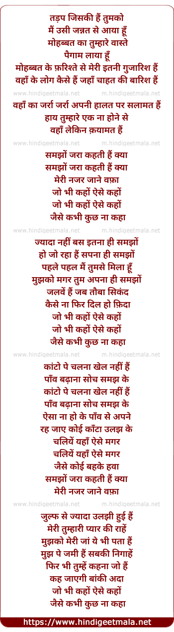 Lyrics of Tadap Jiski Hai Tumko Samjho Zara Kehti Hai Kya Meri Nazar - तड़प जिसकी हैं तुमको समझों जरा कहती हैं क्या मेरी नजर