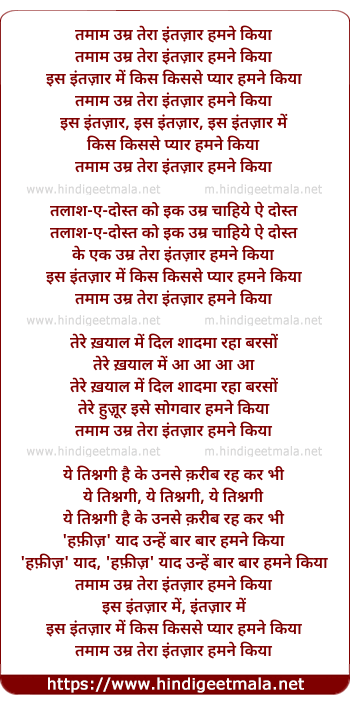 Lyrics of Tamaam Umr Teraa Intazaar Hamane Kiyaa - तमाम उम्र तेरा इंतज़ार हमने किया