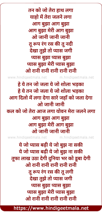 Lyrics of Tan Ko Jo Tera Hath Lage - तन को जो तेरा हाथ लगा