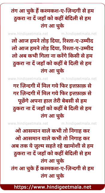Lyrics of Tang Aa Chuke Hain Kashmakash E Zindagi Se Ham - तंग आ चुके हैं कश्मकश-ए-ज़िन्दगी से हम