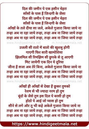Lyrics of Tanhaa Ab Naa Jiyaa Jaye Tanhaa - तन्हा अब ना जिया जाये तन्हा